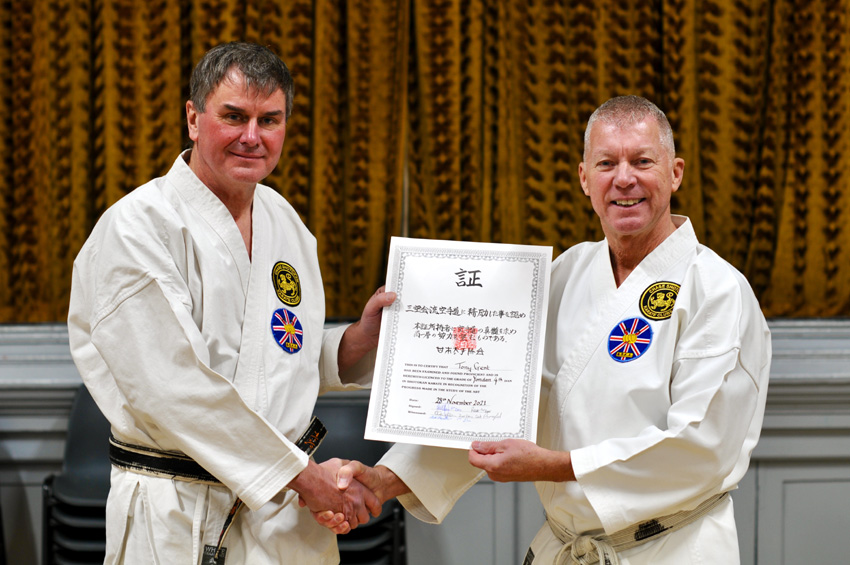28th November 2021 - BLACK BELT SUCCESSES Congratulations to Tony Gent who graded to 4th Dan Black Belt and to Jonathan Rowbury who successfully graded to Black Belt 1st Dan in front of Senior instructors on Sunday 28th November 2021 at our St Aldhelms Branksome location. It was a gruelling grading where Jonathan had to take the workout, show his teaching abilities, perform various difficult movements from the Black Belt Grading syllabus, advanced Kata, followed by Kumite/free-fighting. It was well supported by many members and it is hoped that they will not only be inspired but will encourage others and new members in the future.